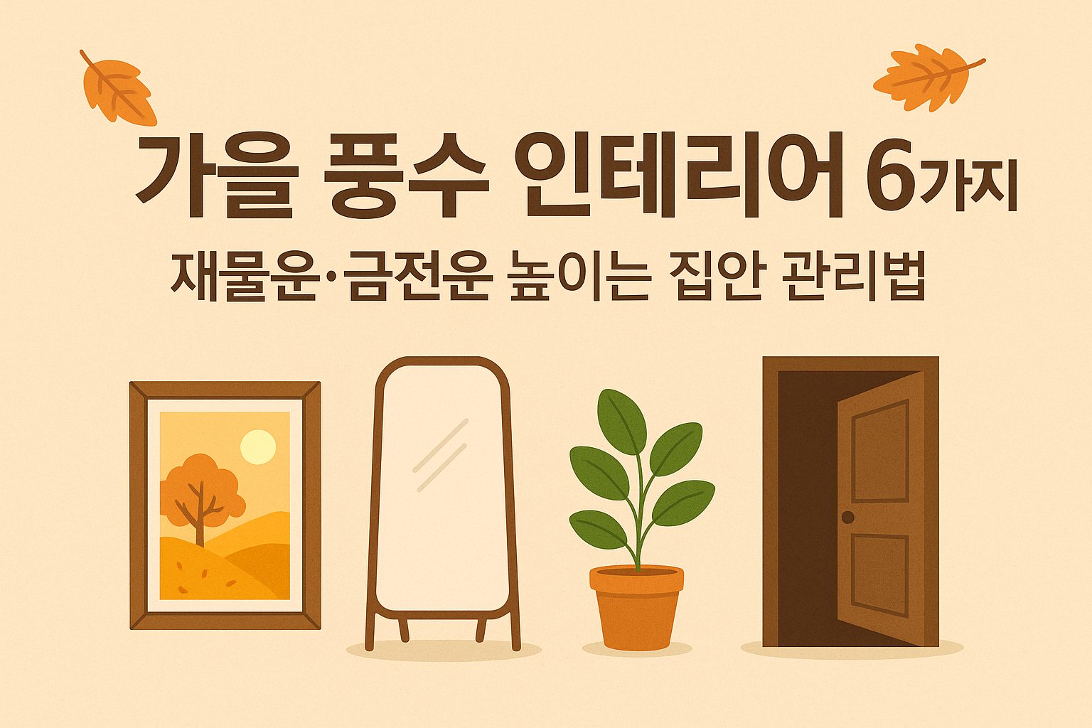 가을은 수확의 계절이자 재물운이 드러나는 시기입니다. 현관·주방·거실·그림·식물 관리와 대청소 등 가을 풍수 인테리어 팁을 정리했습니다.